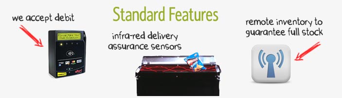 All of our vending machines are equipped with infra-red delivery-assurance sensors, debit/credit card readers, custom graphics and wireless reporting devices to ensure reliable operattion and product stock.
